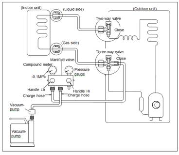 Therefore, the indoor units and the pipes between indoor and outdoor units must be leak tested and evacuated to remove gas and moisture from the system.